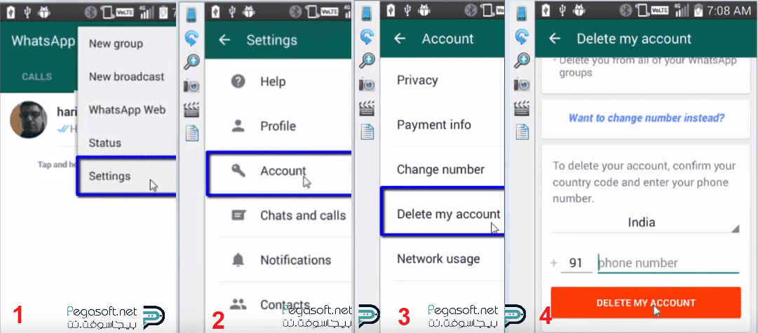 - في الواتس اب أنتقل إلى الإعدادات ثم الحساب ثم حذف حسابي.