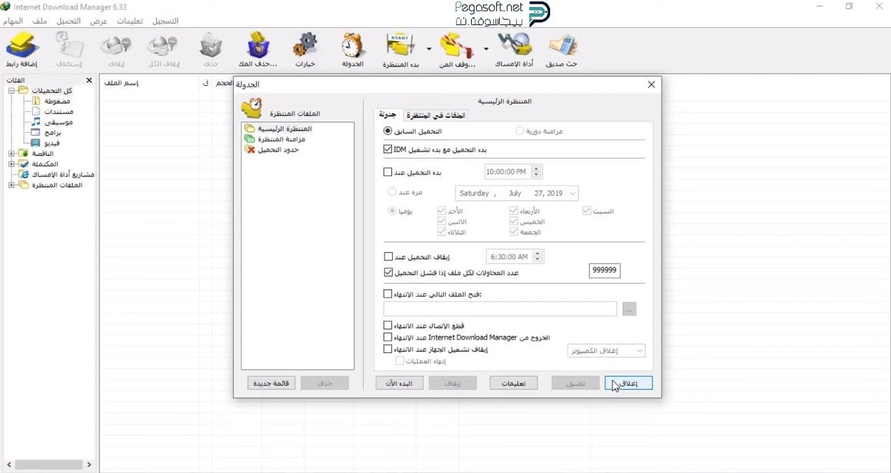 - جدولة التحميلات:-وذلك الخيار يعني أن كل ما تريد تحميله سوف يُحمَّل تباعًا، حيث يبدأ بالأول ثم الثاني وهكذا، ولكن يمكنك التحميل دون جدولة الملفات، وذلك يعني أنه سوف تحميل الملفات معًا ولكن هذا ما قد يسبب مشكلة لك في سرعة الانترنت لذلك برنامج الدونلود مانجر عربي يتيح لك كلا الخيارين، كما يمكنك ترتيب الملفات تبعًا لنوعها أو توقيتها.