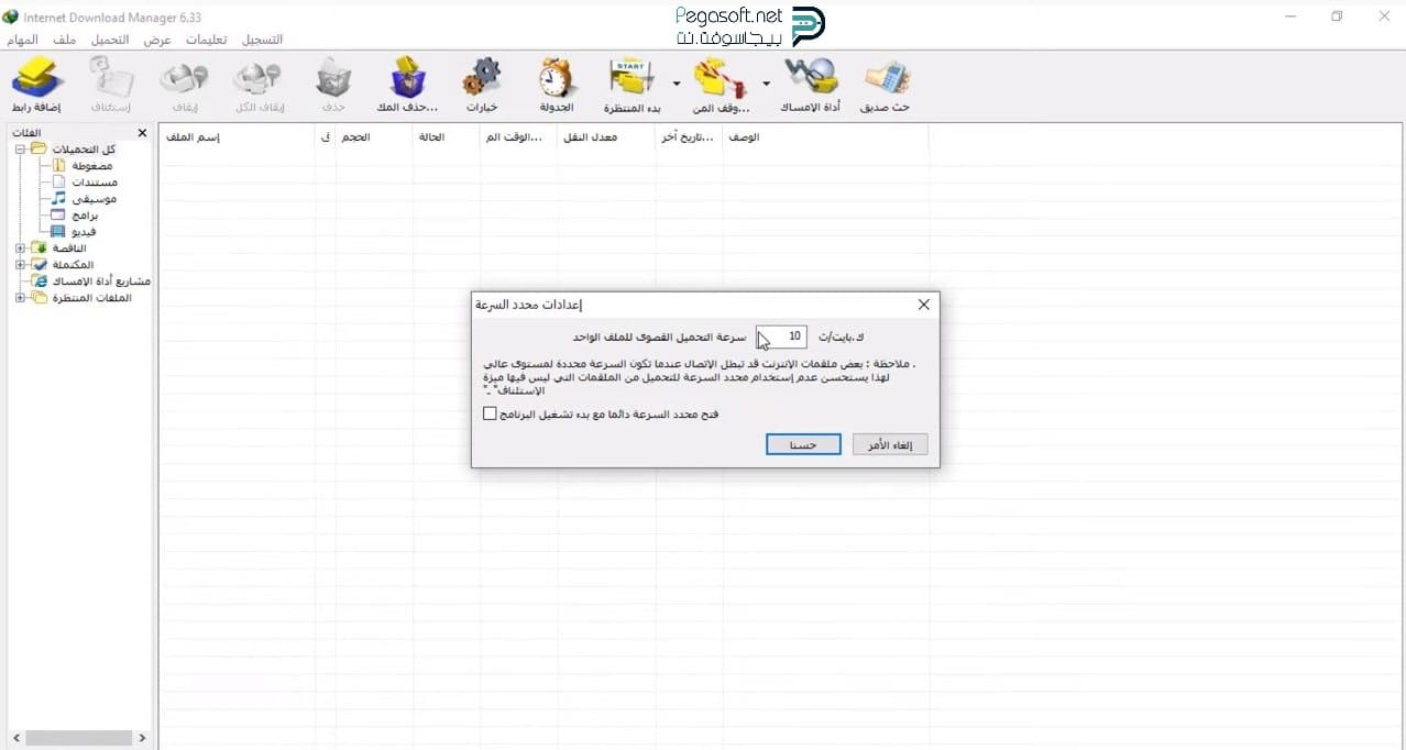 - زيادة سرعة التحميل والتحكم فيها:- بداخل البرنامج مؤشر يعبر عن السرعات التي يسمح بها البرنامج، وذلك حتى يتيح للمستخدم الحرية الكافية، فمثلًا إذا كنت تقوم بشيء عبر الأنترنت وفي نفس الوقت ترغب في تحميل ملف ما عبر الأنترنت، فيمكنك التقليل من سرعة التحميل في البرنامج وذلك حتى لا يؤثر على مهمتك الأخرى، أما إذا كنت ترغب بالتحميل السريع فيمكنك تسخير كل سرعة الانترنت في هذا التحميل، ويمكنك التحكم عبر الذهاب إلى تبويب downloads ثم أختيار speed limiter من القائمة، وأختيار settings ثم ضبطها على السرعة المطلوبة لذلك.