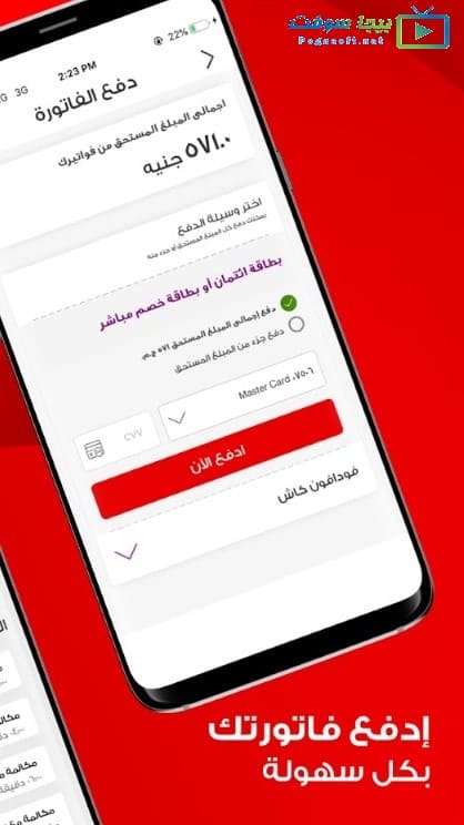 - يمكنك من خلال برنامج أنا فودافون دفع الفواتير الخاصة بك، ويمكنك أيضًا تحويل رصيد إلى أي شخص آخر.