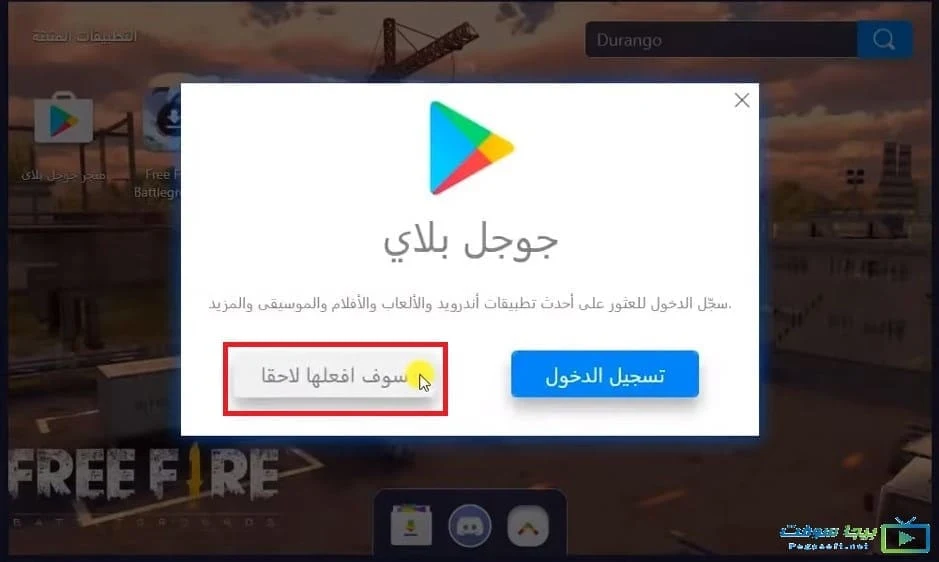 - 4- أثناء تنزيل free fire والملفات على الحاسوب سوف تظهر رساله لتسجيل حساب جوجل بلاي الخاص بك ولكن سوف نتجاهلها ونضغط سوف أفعلها لاحقا.