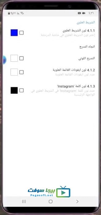- من هذه المميزات إمكانية تعديلك لشاشة المحادثة وشاشة التعليقات، كما تستطيع أن تقوم بتغيير الواجهة والتعديل على ألوان الشريط العلوي والشريط السفلي، أو قيامك بأختيار الوضع الشفاف.