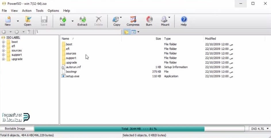 - أفتح ملف الأيزو الخاص بنسخة الويندوز ببرنامج باور أيزو.