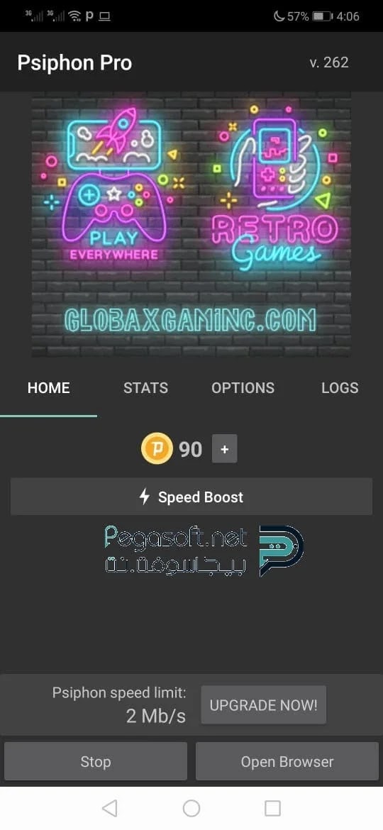 - الأيقونة الثانية في البرنامج تسمى ” PSICASH ” وهي ميزة شحن السرعة الخارقة، فيمكن من خلال هذه الأيقونة القيام بزيادة السرعة من خلال مشاهدة الفيديوهات المختلفة، كما يمكن شراء سرعات إضافية أيضًا للبرنامج للتصفح الأسرع.