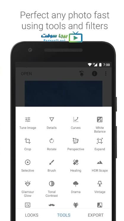 يُعد Snapseed أحد أكثر تطبيقات تحرير الصور تنزيلًا المتوفرة لأجهزة الآيفون وأيضًا الأندرويد، إنه غاية في الوضوح وسهل الاستخدام مما أدى إلى حصوله على شعبية عالية، إلى جانب وظائف التحرير القياسية مثل السطوع والتباين، يتم تحميل Snapseed أيضًا بميزات رائعة إضافية مثل الفرشاة والأجواء والمنظور.