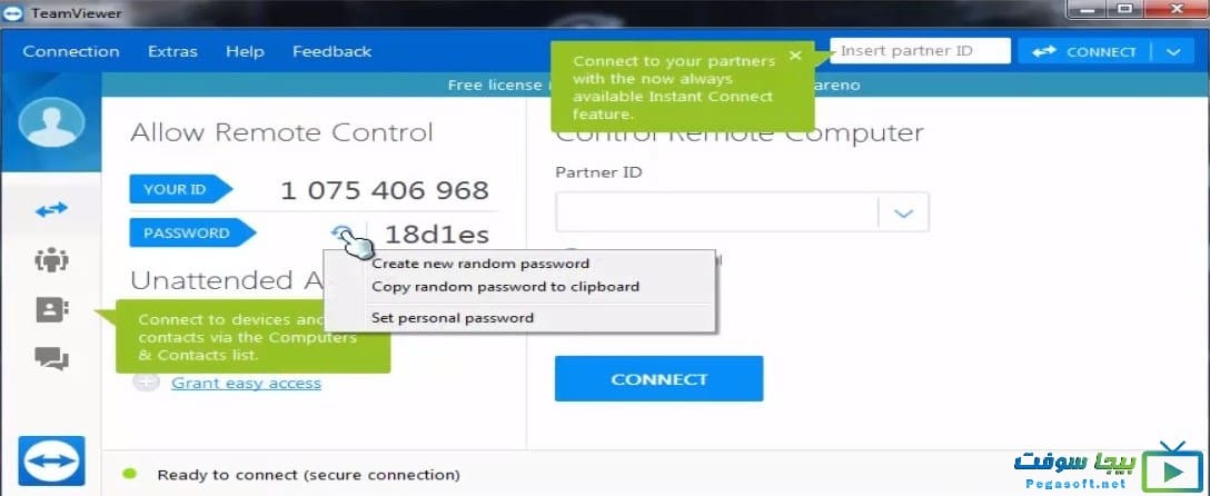 يعطيك البرنامج عنوان افتراضي وهمي خاص بجهازك يسمى أي دي “ID” وايضاً كلمة سر افتراضية حيث أنه من خلالها يمكنك تغييرها كما تشاء وبإمكان تلك البيانات أن تتحكم في جهازك من أي منطقة في العالم طالما أن الجهازين متصلين بالإنترنت.