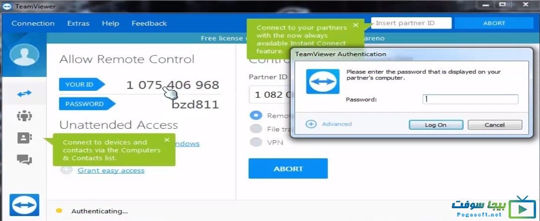 وعند رغبتك في بدء أي جلسة على جهازك وتريد السماح للطرف الاخر بان يدخل الى جهازك فقط قم بإرسال الاي دي والباسورد اليه.