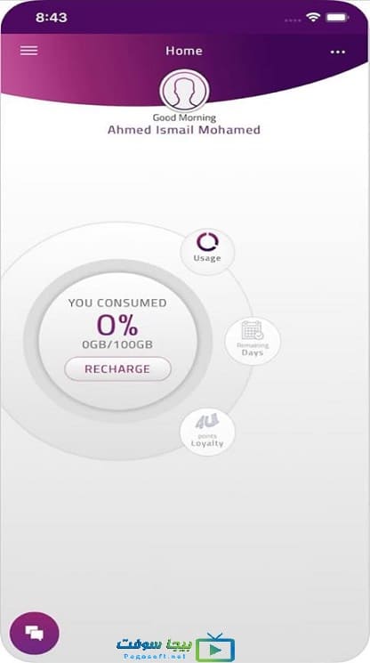 - بعد القيام بتسجيل الحساب الشخصي على البرنامج، بشكل تلقائي ستنبثق إليك الشاشة الأساسية ومن أبرز مميزاته اعلامك النسبة المئوية المستهلكة من باقة الانترنت الأرضي، والمسجلة على رقم هاتفك المحمول المسجل عبر الحساب الشخصي.