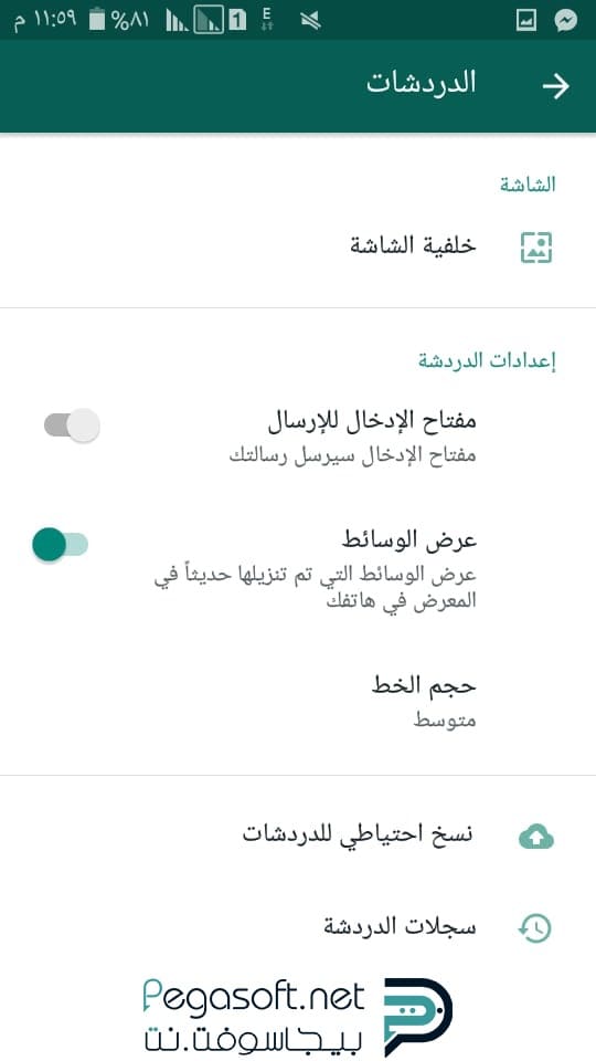 - الدردشات: يمكن من خلالها التحكم في خلفية الشاشة، ومفتاح الإدخال للإرسال، وعرض أخر الوسائط التي تم تحميلها في المعرض الخاص بالهاتف، كما تتيح إمكانية تغيير الخط والتحكم به، بالإضافة إلى النسخ الاحتياطي للدردشات، وأخيرًا التحكم في سجلات الدردشات، سواء نقل الدردشة أو أرشفتها، أو مسحها نهائياً، أو حذف محتوى الدردشة فقط.
