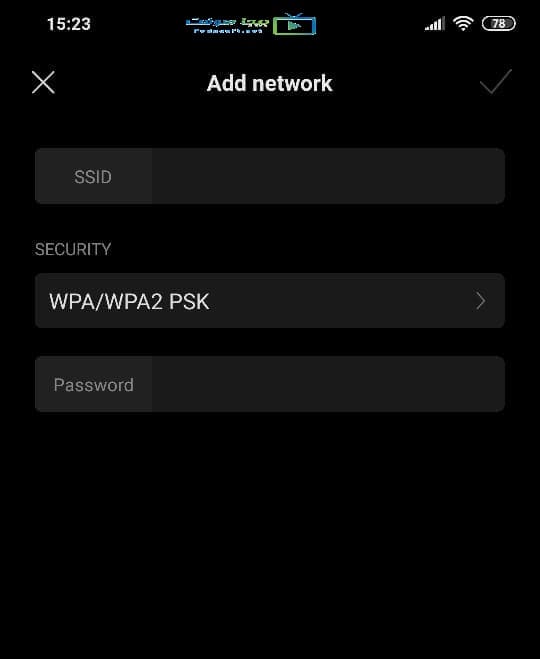 - بعدها ستظهر لنا القائمة التالية نقوم فيها بكتابة أسم الشبكة بشكل صحيح، وأختيار نظام الأمان ومن ثم كتابة الرقم السري الخاص بنا وضغط علامة صح.