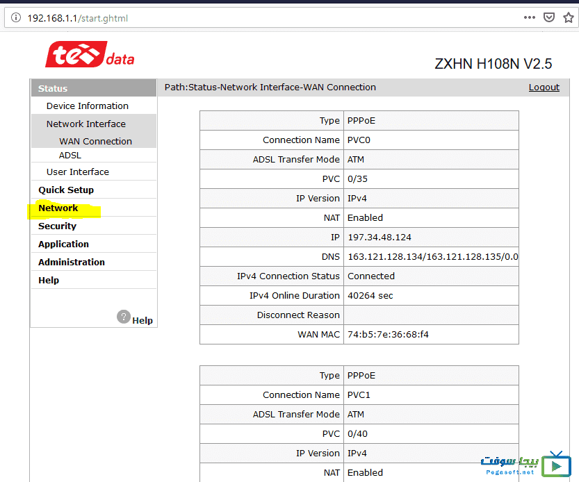 - 6- من أجل معرفة طريقة تغير باسورد راوتر واي فاي tedata نقوم بالضغط على كلمة Network الموجودة في المستطيل على اليسار .