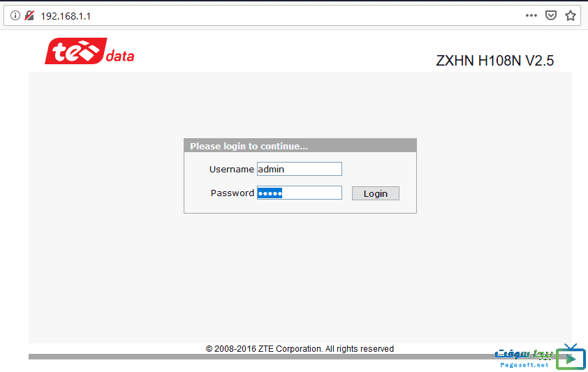 - 3- بمجرد كتابتك للأرقام والضغط على زر انتر ستدخل إلى صفحة الويب التالية والتي سيتطلب منا فيها كتابة اسم مستخدم username وكلمة مرور password وفي الخانتين سنقوم بكتابة كلمة admin ومن ثم نضغط على تسجيل دخول log in، كما بالصورة.