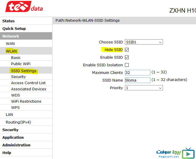 - 4- من القائمة التي ستظهر نقوم بأختيار كلمة WLAN ومن ثم نختار منها كلمة SSid Settings ومن يمين القائمة نقوم بتحديد مربع Hide SSID والذي من خلاله ستتمكن من إخفاء شبكة الواي فاي الخاصة بك وزيادة حمايتها كما بالصورة3.
