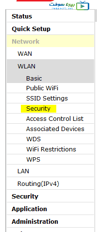 - 8- من قائمة WLAN سينسدل منها قائمة أخرى نقوم فيها بأختيار Security.