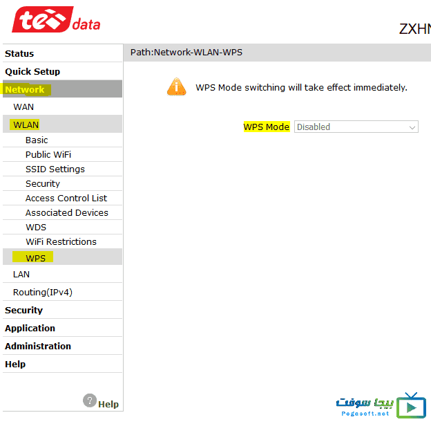 - 5- ربما لا تعمل الخطوة الرابعة مع بعض الأنواع من الراوتر لذا سنستخدم هذه الخطوة، وفيها بعد الضغط على كلمة WLAN نقوم باختيار WPS، ومن الشاشة على اليمين نحدد وضع WPS Mode إلى Disabled.