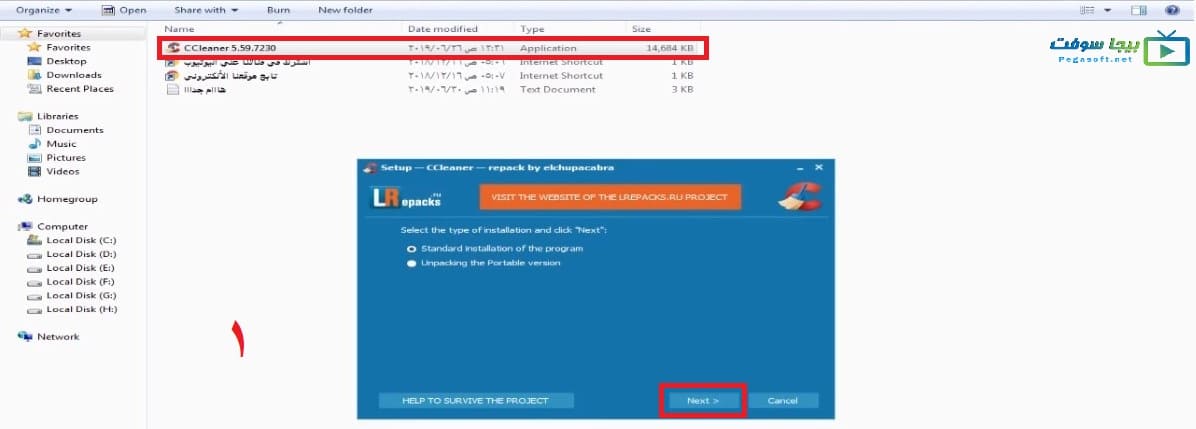 - 1- بعد تنزيل برنامج ccleaner على الجهاز الخاص بك يمكنك الذهاب إلى الملف الذي تم تحميله وفك الضغط والدخول إلى الملف وبدأ تثبيت برنامج سي كلينر وإتباع الخطوات التالية.