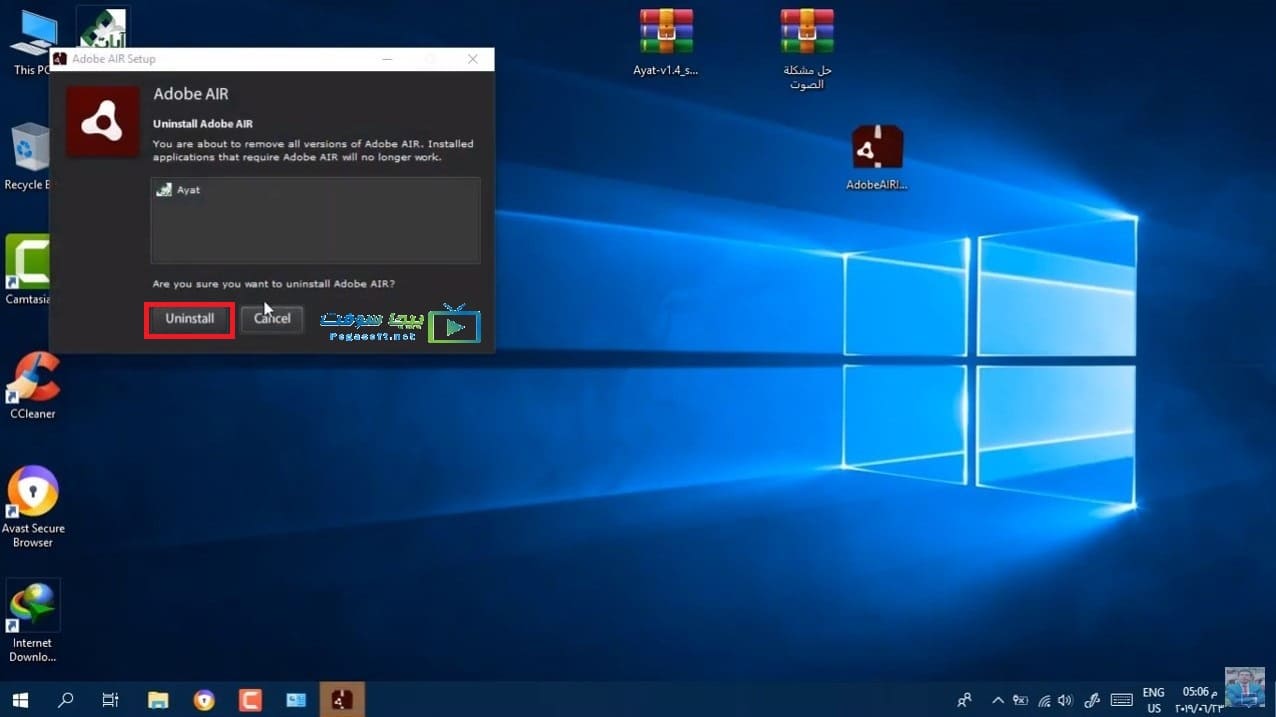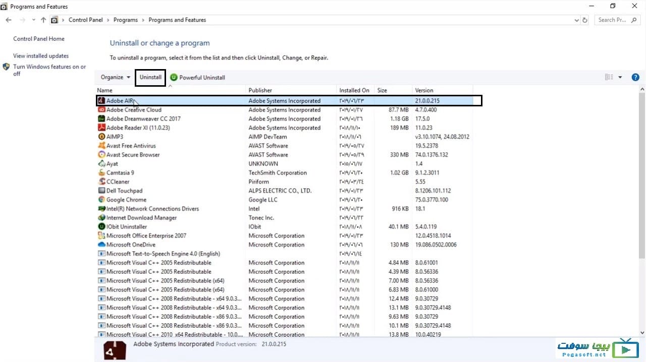 - تختار برنامج أدوبي أير، وتلغي تثبيت النسخة القديمة منه بالنقر على كلمة Uninstall.