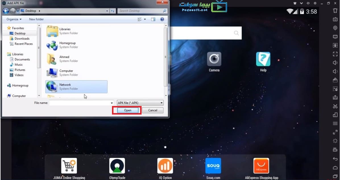 - ثم نقوم بإختيار الملف المنزل للعبة أو التطبيق الذي تم تنزيله من قبل للعبة أو التطبيق ثم نقوم بالضغط على Open سوف يقوم نوكس بلاير بتثبيت اللعبة أو البرنامج على الواجهة.
