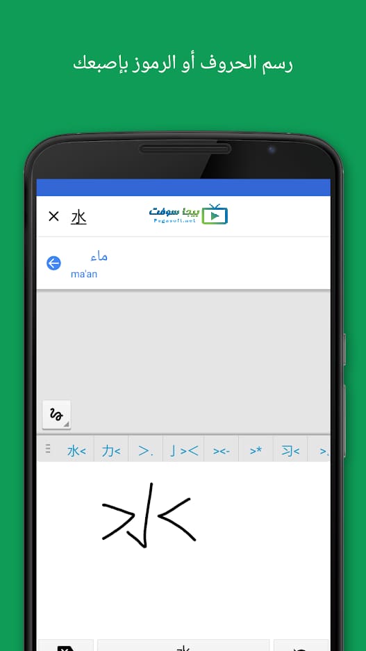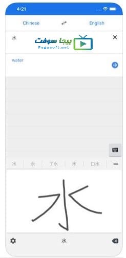 - الكتابة بخط اليد :- فقط قم بالضغط على الأيقونه الخاصة بالكتابة باليد و قم بالكتابة على الشاشة ليحلل البرنامج الكتابة لكلمات و يقوم بترجمتها بشكل مباشر هذه الميزه تدعم أكثر من 90 لغة و منهم اللغة العربية.