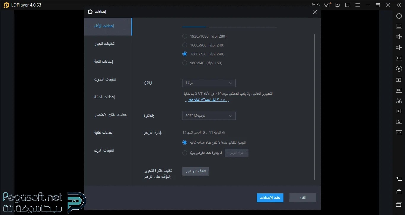 التي تعمل على أن تحاكيها بجانب نوع CPU, RAM من خلال قائمة الإعدادات