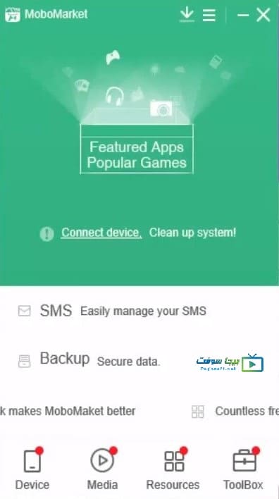 - متاح على الكمبيوتر:- من أفضل المميزات التي يمتلكها متجر mobomarket، هي إمكانية تحميله على جهاز الكمبيوتر الخاص بك وليس للأندرويد فقط،وذلك من خلال وصلة الـ USB وتوصيلها بجهاز الكمبيوتر، كما يمكنك التحكم الكامل بالملفات وتحميلها على هاتفك الأندرويد، بالإضافة إلى أنه يدعم جميع نسخ الويندوز بداية من ويندوز xp حتى ويندوز 10, ويندوز8.1, وويندوز 7, كما يمتاز متجر موبوماركت للكمبيوتر بأنه خفيف جداً ولا يتطلب إستهلاك موار الكمبيوتر بشكل كبير.