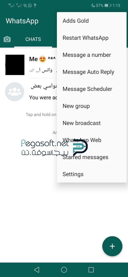 الآن يأتي دور تحميل وتثبيت تطبيق واتساب بلس الذهبي ثم نقوم بدمج الملف الاحتياطي مع التطبيق بالدخول إلى إعدادات التطبيق ثم الدردشات قم نختار اضافة نسخ إحتياطي للدردشات.